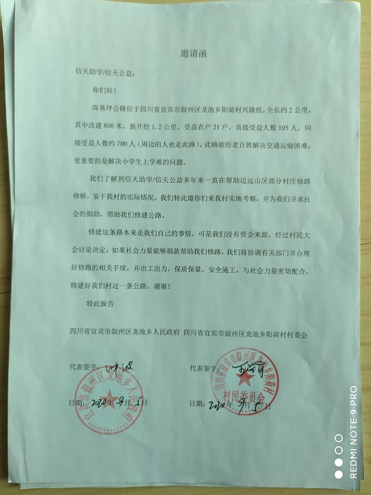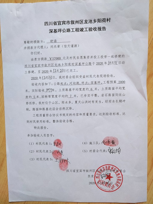 深基坪 公路位于四川省 宜宾 市 叙州 区 龙池 乡 阳荷 村 兴隆 组。全长约 2 公里,其中改建800米,新开挖1.2公里。起点:河沟湾,终点:深基坪。受益农户 21 户,直接受益人数 105 人,间接受益人数约 700 人(周边的人也从此路过)。修路能给老百姓解决交通运输困难、解决小学生上学难的问题。村民共集资 21000 元,计划修通土路、支路、涵管、并铺设大部份路面石,力争雨季也能通车。