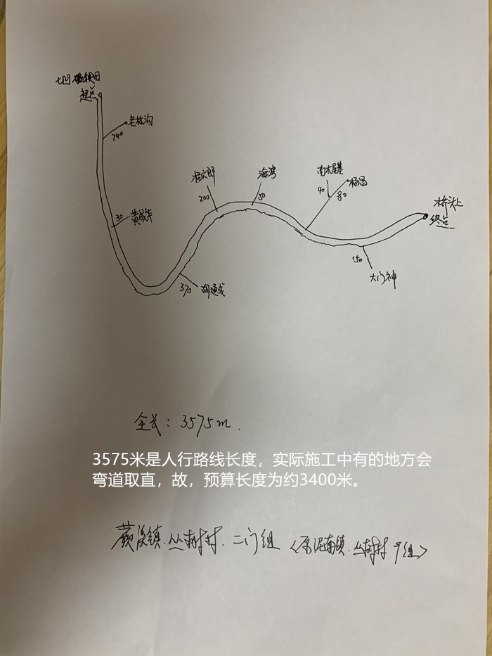3575米是人行路线长度,实际施工中有的地方会弯道取直,故,预算长度为约3400米。