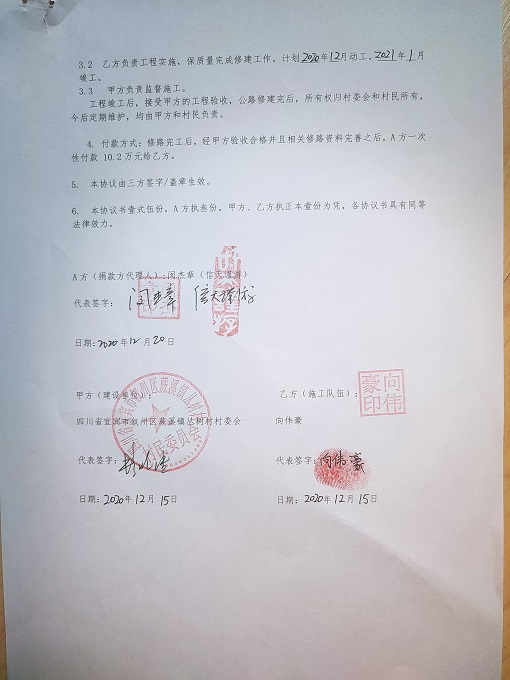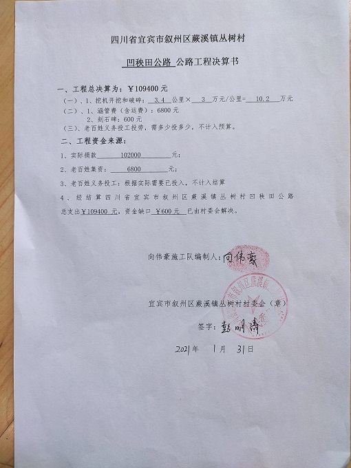 (5)修路预算分好几部分,有挖掘机、涵管、炸药爆破(山崖需要爆破)或者岩石破碎、堡坎、村民义务工、征地等。修路,捐款方不全包,捐款方出一大部分钱:挖掘费用、部分山崖爆破(如有的话)或破碎等。村民出义务工、涵管、征地费、或部分破碎费用,村民小额集资。