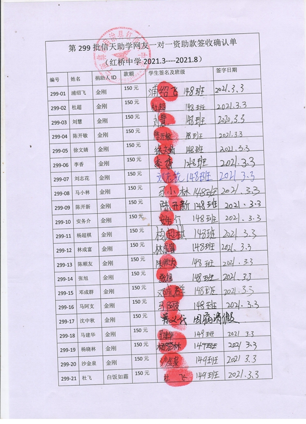 第299批红桥中学(2021年3月-2021年8月)受助学生签字确认单