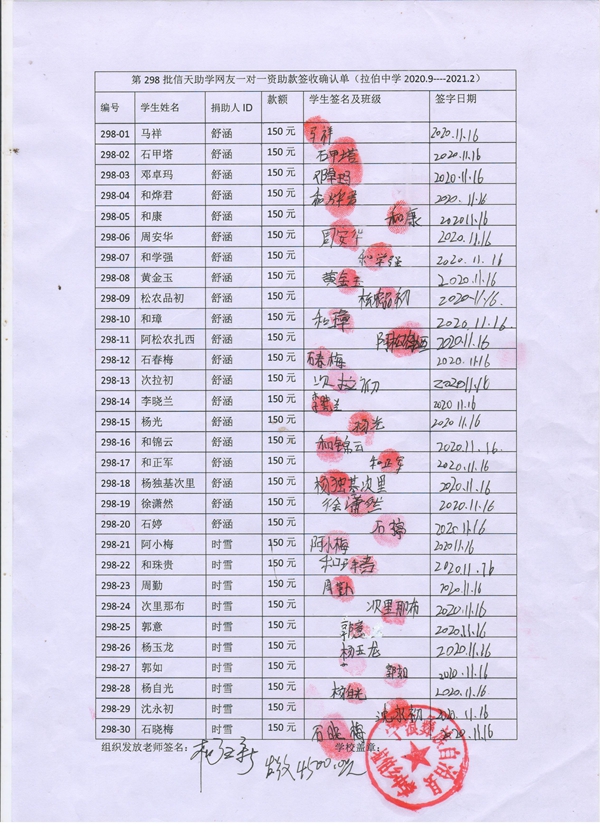 第298批拉伯中学(2020年9月-2021年2月)受助学生签收单