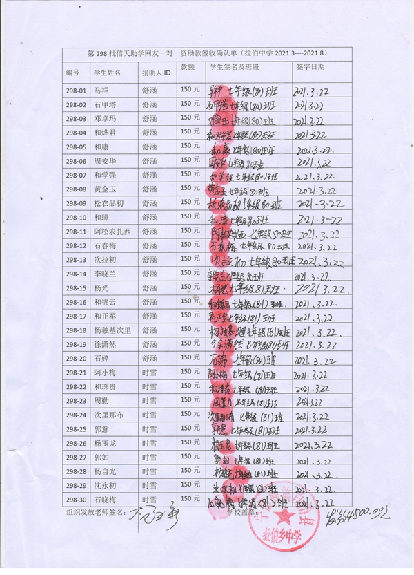 第298批拉伯中学(2021年3月-2021年8月)受助学生签字确认单