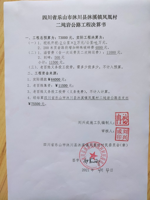 (5)修路预算分好几部分,有挖掘机、涵管、炸药爆破(山崖需要爆破)或者岩石破碎、堡坎、村民义务工、征地等。修路,捐款方不全包,捐款方出一大部分钱:挖掘费用、部分山崖爆破(如有的话)或破碎等。村民出义务工、涵管、征地费、或部分破碎费用,村民小额集资。
