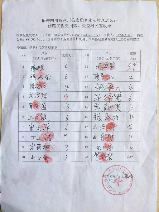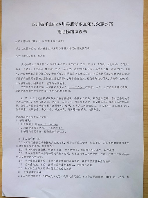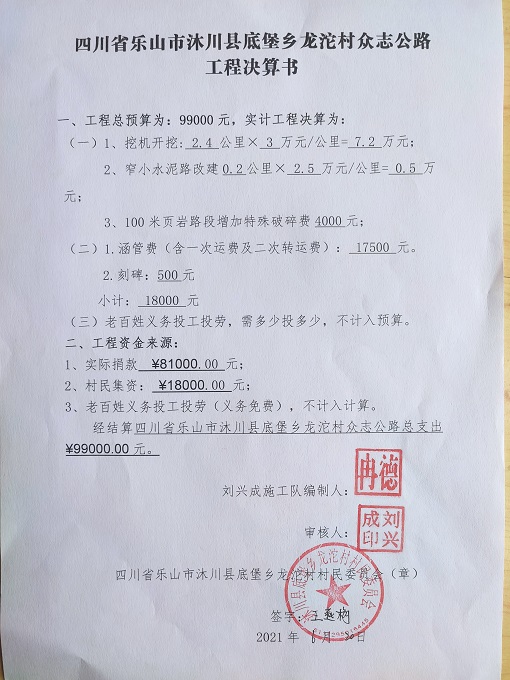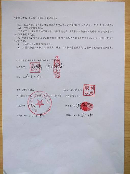 (5)修路预算分好几部分,有挖掘机、涵管、炸药爆破(山崖需要爆破)或者岩石破碎、堡坎、村民义务工、征地等。修路,捐款方不全包,捐款方出一大部分钱:挖掘费用、部分山崖爆破(如有的话)或破碎等。村民出义务工、涵管、征地费、或部分破碎费用,村民小额集资。