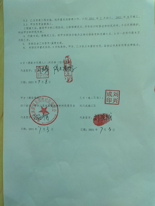 (5)修路预算分好几部分,有挖掘机、涵管、炸药爆破(山崖需要爆破)或者岩石破碎、堡坎、村民义务工、征地等。修路,捐款方不全包,捐款方出一大部分钱:挖掘费用、部分山崖爆破(如有的话)或破碎等。村民出义务工、涵管、征地费、或部分破碎费用,村民小额集资。