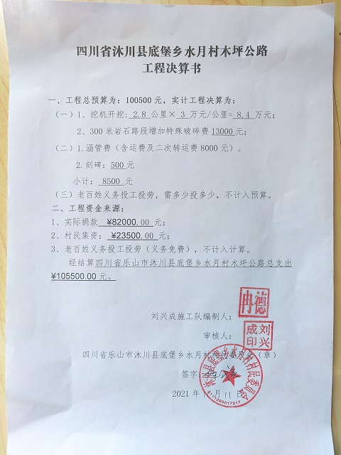 (5)修路预算分好几部分,有挖掘机、涵管、炸药爆破(山崖需要爆破)或者岩石破碎、堡坎、村民义务工、征地等。修路,捐款方不全包,捐款方出一大部分钱:挖掘费用、部分山崖爆破(如有的话)或破碎等。村民出义务工、涵管、征地费、或部分破碎费用,村民小额集资。