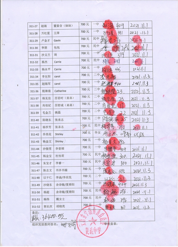 311-50,原263-57,杨超,中考成绩:349分,录取学校:民族中学296班,资助人:余诗敏/夏楷阳;