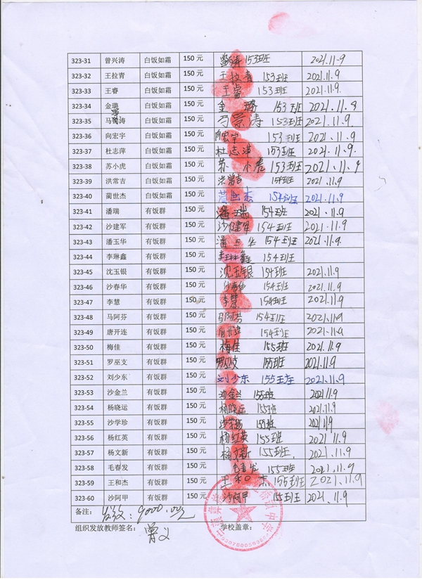第323批红桥镇中学(2021年9月-2022年2月)受助学生签收单