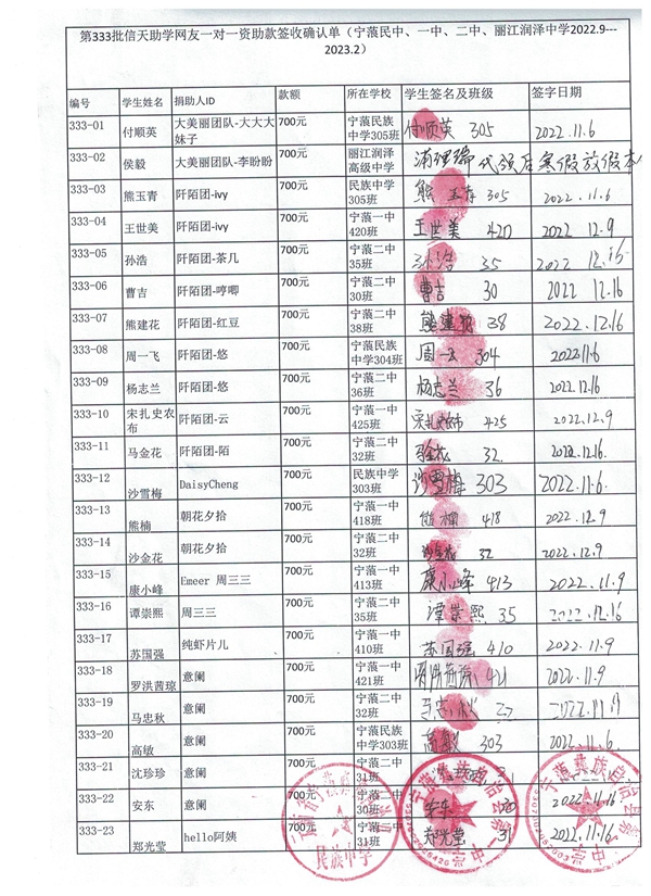 第333批续捐-宁蒗二中(2023年3月-2023年7月)受助学生签字确认单: