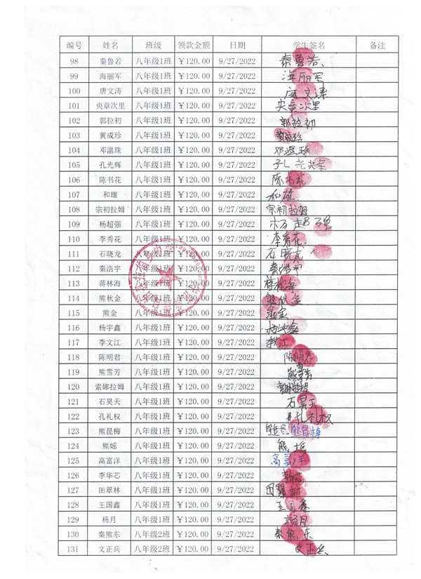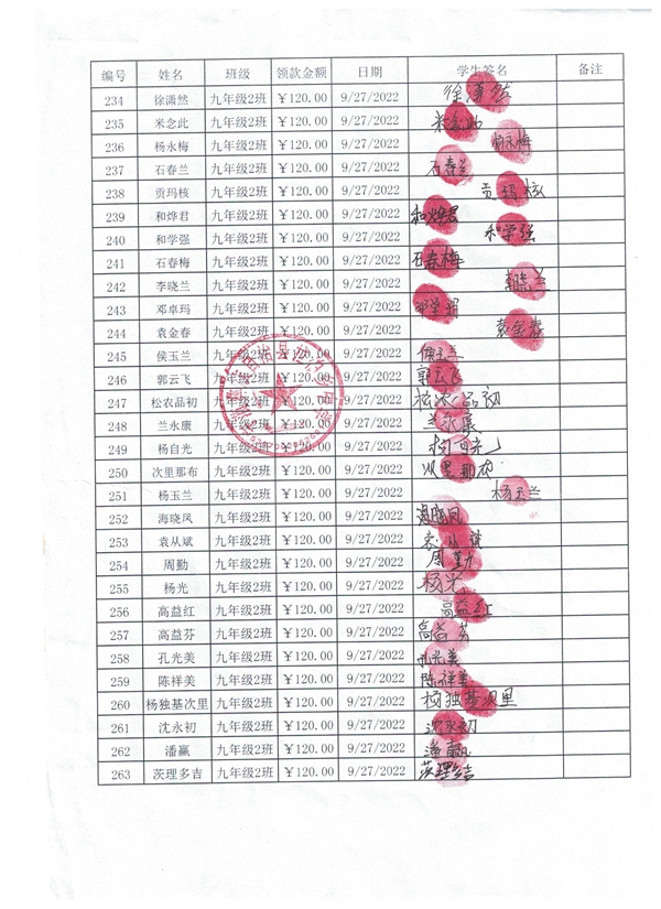 拉伯中学,2022-2023年早餐计划第一次发款签收单