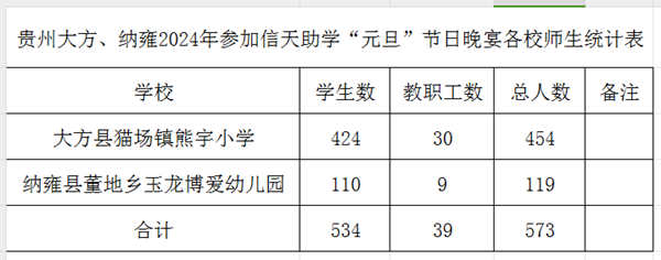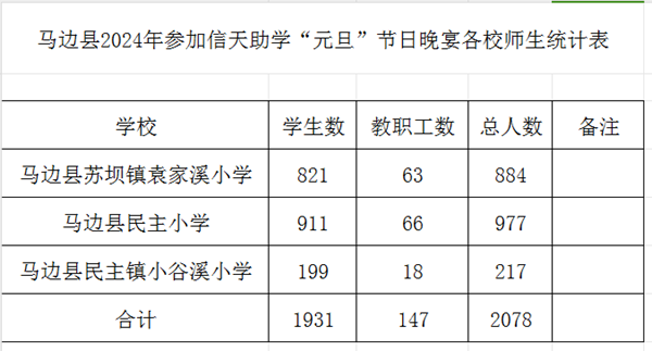 云南省丽江市宁蒗县2024年元旦节日宴会各校人数统计表: