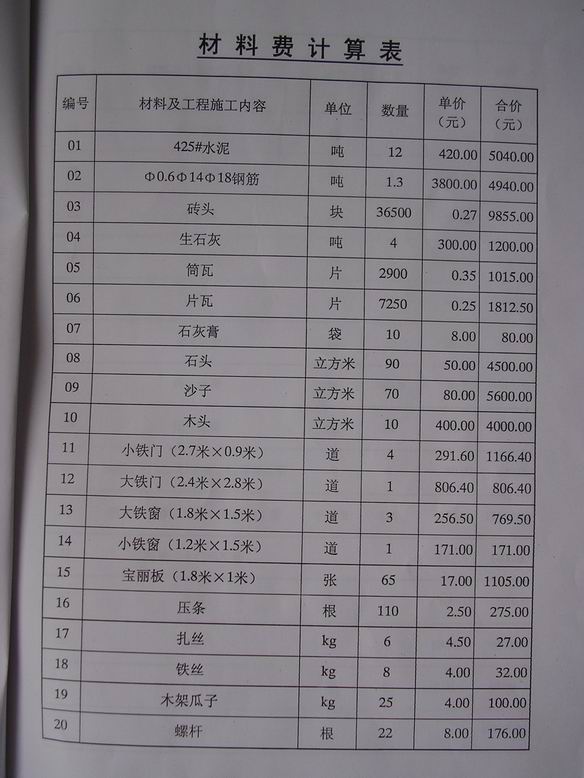 1)                水泥(425#)        吨        12        420.00        5040.00