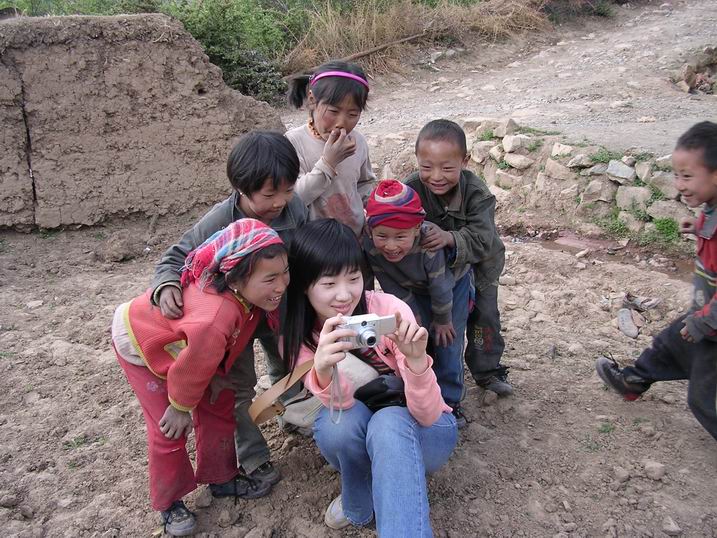 他们站在那里很乖巧,集中着所有的注意力打量我手里的照相机,眼神充满好奇又带着一丝不安。村长和他们说着些什么,很快我的镜头里就充满了耀眼的微笑,那是一种很纯真的又带着一些憨气的笑容,超越了语言、超越了距离一瞬间感染了我。我拿着相机走到她们旁边,把刚才的照片在液晶屏里放大了举到他们眼前,几个胆大的男孩子伸了头凑过来认真的看,女孩子们则有点羞涩的躲在一边。看着看着,这些孩子眼睛里渐渐露出兴奋的神采,他们开心的叫着说着些什么。