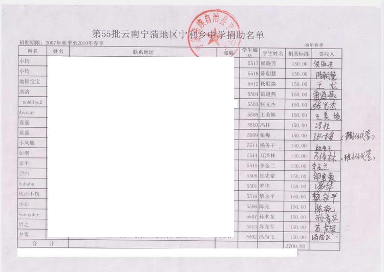 6、捐助款收齐后,由凌之按学期汇给学校的联络老师,由老师负责发放给学生。学生的签收单会按学期返回到凌之。凌之将在网上公布,请注意后花园呼朋版的固顶贴《助学大全》。